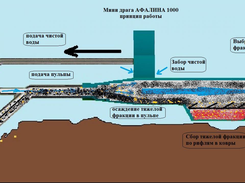 6) Продуманность технического решения: засасывая фракции, драга сразу делит их на легкие и тяжелые, а процесс осаждения тяжелой фракции проводится в специальном шлюзе.