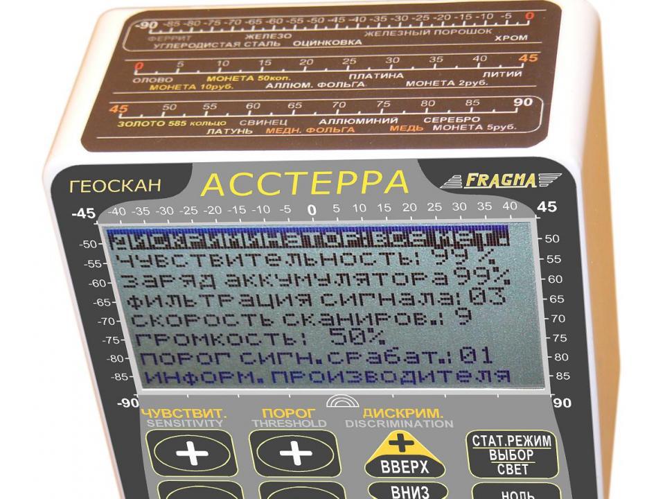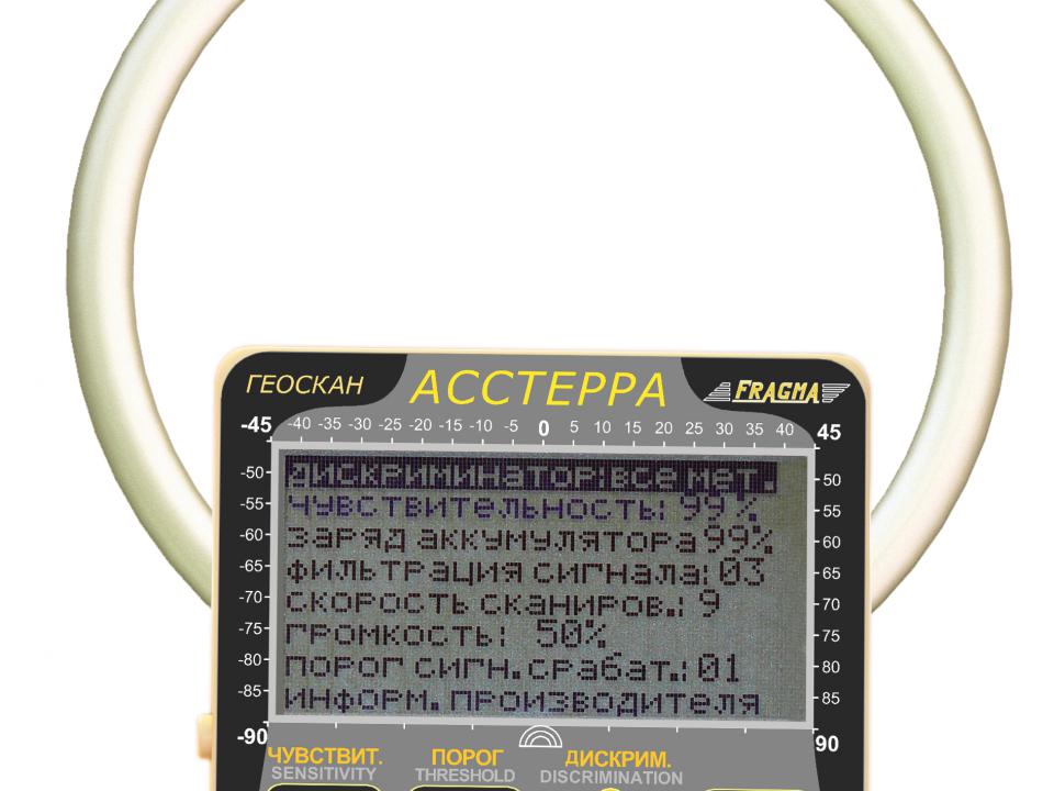 АССТЕРРА определяет мелкие золотые самородки и др. металлические объекты среди гранита, бутового камня, гальки и других "горячих" камней, что не под силу обычным металлоискателям. АССТЕРРА оснащен 22-х уровневым дискриминатором, и системой экспертных настроек для специалистов поиска. Система экспертных настроек позволяет пользователю самому выбирать частотную полосу пропускания сигнала (задается нижняя и верхняя частота полосовго фильтра) для динамического режима поиска.